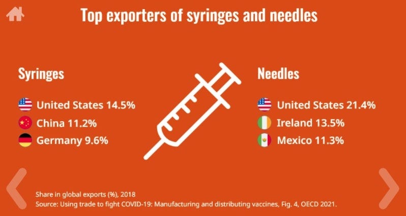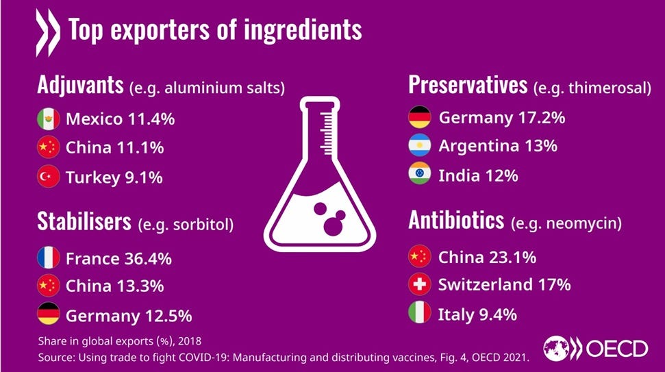 Let’s dig a little deeper into global supply chains for vaccines. The ability to quickly increase production, supply and trade in global vaccines trade was astonishing. And yet we seem to just take it for granted. According to the OECD, “the value of global trade in vaccines, that is all types of vaccines for human medicine in the first six months of 2021 was 26% higher than for the whole 12 months of 2020, and 30% higher than in 2019.”
