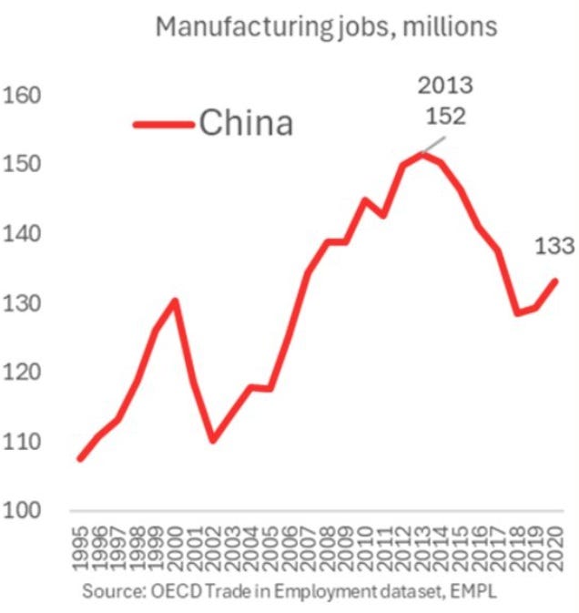That doesn’t mean China, or the U.S., are producing less. Manufacturing becomes more efficient over time, from better technology and techniques. During the early part of the pandemic, when people around the world stopped traveling and eating out, they instead spent money on things. China was building many of those things so briefly there was an increase in manufacturing jobs in China. In all likelihood they will again start losing manufacturing jobs going forward. If not, that’s a sign China’s economy is becoming less efficient and productive which is a negative for its economy not a positive.