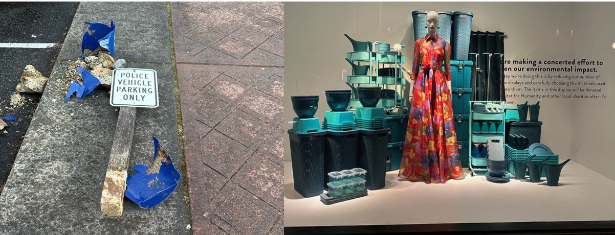 *It’s difficult to read the writing in the photo of the retail display on the right (Editor: because it’s a lousy photo: INTN: Just like you to blame the photographer and not the tools): “We’re making a concerted effort to lessen our environmental impact. The way we’re doing this is by reducing our number of window displays…” Maybe so, but of course, fewer window displays means less targets for vandals.