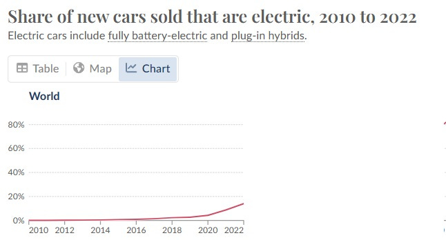 Even though many American conservatives boo like folkies at the Newport Jazz Festival in 1965, the world’s electric transformation continues unabated. Case in point are the share of electric cars sold. As you can see in the first Our World in Data chart below, they went from 4 percent in 2020 to 14 percent in 2022. In 2023 preliminary data shows they reached 18 percent of the share of cars sold. As you can see in the second chart, nearly a third of new car sales in China are electric and a fifth of cars in the European Union.