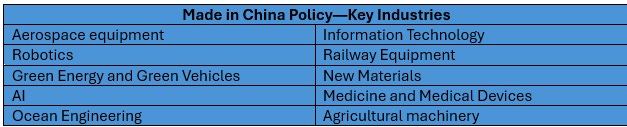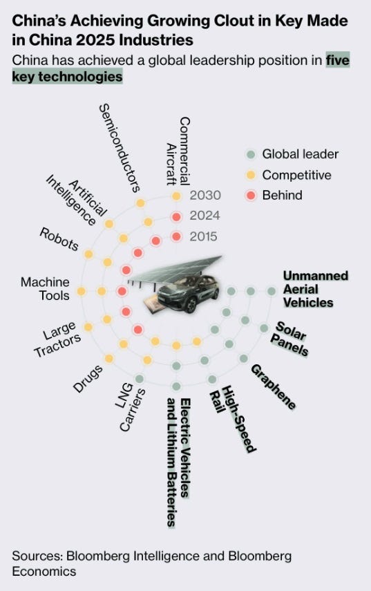 China has been fairly successful in building up what it deems strategic industries. You can see that in the chart below from Bloomberg’s Joe Weisenthal. The Made in China 2025 policy begun in 2015 under Xi Jinping determined 10 industries it wanted China to be competitive in by 2025, including IT, robotics, green energy and aerospace. China has become competitive in all of these industries except for airplanes. That does not sound like incompetence to me.